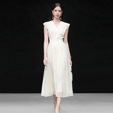 高货外贸精品雪纺蕾丝连衣裙83879高腰显瘦A字裙夏季垂顺休闲长裙