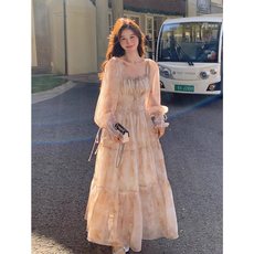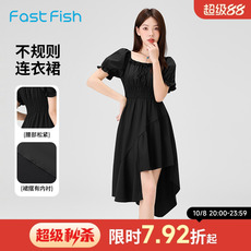 甜橘之夏 法式小方领连衣裙女夏季显瘦收腰a字长裙