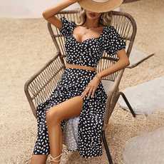夏季花色度假风旅游V领复古长裙遮肉棉麻连衣裙过膝长裙子圆点