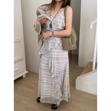 LLANO不规则裙摆格纹背心连衣裙复古收腰甜美短裙中长裙女装夏季