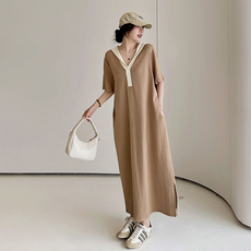 韩国新款大码女装夏季宽松睡裙显瘦过膝长裙休闲纯色连衣裙开叉裙