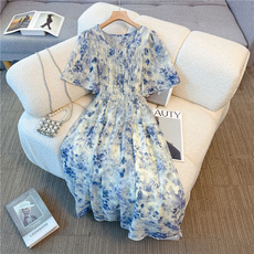 晚白2025年夏新款休闲气质裙子纯棉植物印花长裙亲肤短袖连衣裙