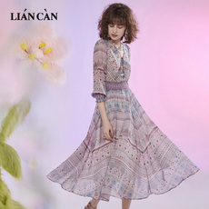 莲灿新中式秋新商场同款波西米亚风时尚百搭V领雪纺九分袖连衣裙
