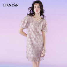 莲灿折扣店新商场同款波西米亚风圆领蕾丝绣花梭织短袖连衣裙