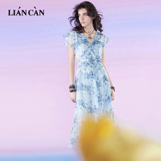 莲灿折扣店新商场同款波西米亚风设计师品牌V领吊带连衣裙长