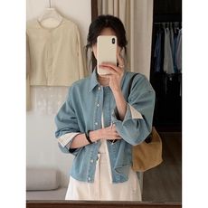 韩系浅蓝色柔软牛仔外套撞色边衬衫女2025春秋新款通勤轻薄短外套