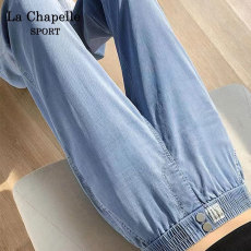 拉夏贝尔天丝牛仔裤女装高腰垂感夏季宽松薄款窄版冰丝阔腿裤子J