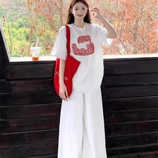 背带裤套装女夏季宽松大码显瘦胖mm阔腿连体裤+纯色短袖t恤两件套