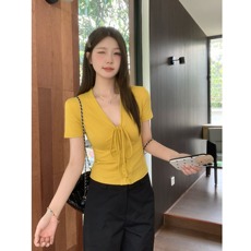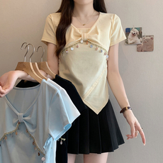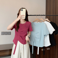 夏季短款短袖T恤女小个子高腰开叉半袖体恤衫女士洋气时尚上衣