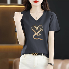 100%纯棉V领显瘦t恤印花减龄洋气宽松胖MM百搭鸡心领上衣短袖体恤