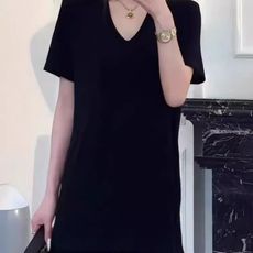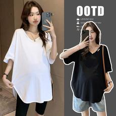 纯棉大码胖mm2-300斤简约纯色V领短袖T恤中长款上衣宽松孕妇服女