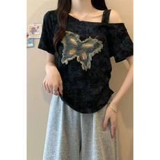 大码扎染露肩短袖T恤女夏季胖mm显瘦小众设计感纯欲辣妹别致上衣