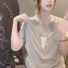 假两件烫钻V领正肩短袖T恤2025夏季大码女装胖mm收腰遮肚显瘦上衣