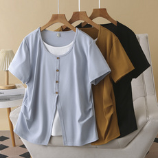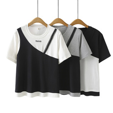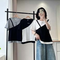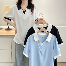 大码t恤女假两件短袖2025夏季新款胖mm200斤时尚拼色翻领半袖上衣
