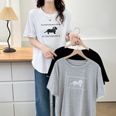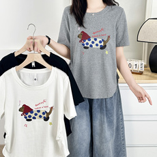 夏季大码女装胖mm显瘦圆领卡通小狗印花正肩短袖t恤小个子穿搭上
