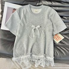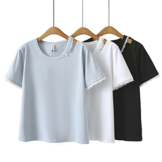 小菲家~2025夏季新款胖MM醋酸水溶蕾丝拼接大码上衣欧货短袖t恤女