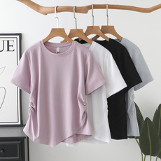 大码女装2025夏季新款胖MM两边褶皱收腰显瘦圆领正肩短袖T恤上衣