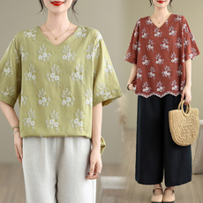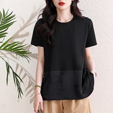 亚麻上衣女夏季大码胖mm拼接螺纹圆领短袖T恤宽松休闲体恤上衣潮