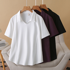 大码女装2025夏季新款胖MM下摆弧形收腰显瘦翻领正肩短袖T恤上衣