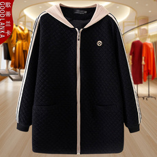 胖太太大码女装连帽风衣外套中长款黑色显瘦宽松妈妈款820306010