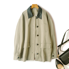 巴恩风撞色拼皮领大口袋中长款外套2025秋季新款长袖女装风衣V649