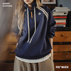 马登美式复古学院风藏青色半拉链立翻高领套头长袖无帽卫衣女士秋