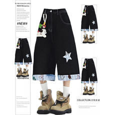 300斤大码美式高街辣妹风七分牛仔裤女胖mm小个子黑色阔腿短裤子