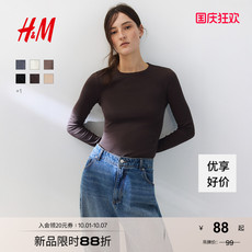 HM女装T恤秋季莫代尔混纺修身显瘦打底衫圆领长袖内搭上衣0999727