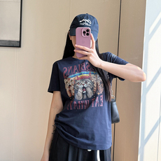 大码胖mm美式猫咪印花正肩短袖t恤女夏季短款修身显瘦上衣打底衫