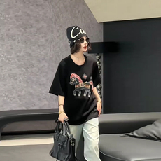 2024冬季新款大码女装胖MM欧货时尚烫钻皇冠百搭洋气磨毛短袖T恤