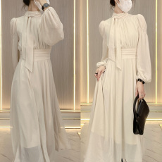 2025年新款白色连衣裙女冬长袖收腰显瘦名媛年会长款裙子长裙秋冬