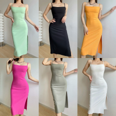 欧美复古法式平口一字肩吊带连衣裙女设计感侧边开叉中长裙包臀裙