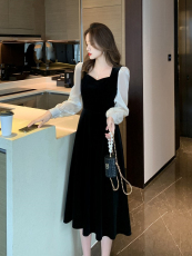 韩国chic法式优雅圆领拼接设计感后背百褶加绒卫衣连衣裙长裙女