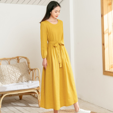 2024春秋新款旅行文艺黄色棉麻连衣裙女收腰显瘦高端气质亚麻长裙