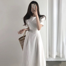 韩国chic小众法式圆领纯色收腰显瘦压褶泡泡袖大摆型连衣裙长裙女