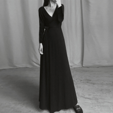 黑色连衣裙长款春秋装2025年新款女显瘦长袖V领修身气质包臀长裙