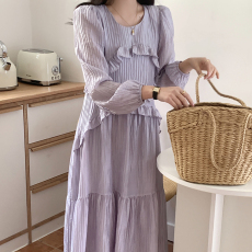 莫代尔圆领条纹短袖睡裙女夏季薄款居家长裙休闲宽松可外穿连衣裙