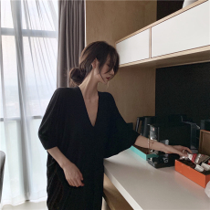 短袖睡裙大码女V领连衣裙夏季莫代尔翻领长裙可外穿宽松过膝裙子