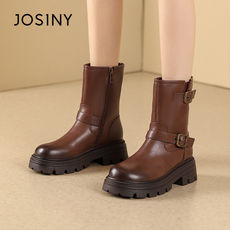 卓诗尼冬季女靴撤柜正品长筒靴复古擦色骑士靴圆头厚底酷感皮带扣