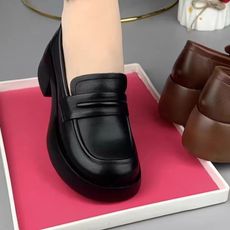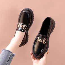 英伦风小皮鞋女厚底增高单鞋百搭粗跟高跟鞋一脚蹬春秋黑色乐福鞋