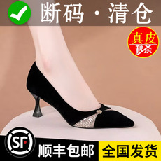 断码清仓真皮深口高跟女单鞋百搭气质粗跟2025春秋季新款尖头皮鞋
