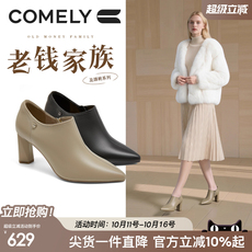 康莉羊皮深口粗跟单鞋2025秋冬新款真皮尖头高跟裸靴商场同款女鞋