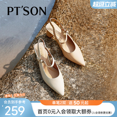 百田森羊皮包头凉鞋女款夏季粗跟优雅尖头半凉鞋女百搭通勤女鞋
