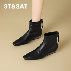 坡跟女鞋2025年新款真皮秋冬磨砂短靴尖头羊皮春秋女靴高跟马丁靴