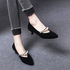 羊皮版~法式气质一字扣带粗跟玛丽珍女鞋尖头单鞋浅口通勤高跟鞋