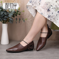 相伴真皮浅口单鞋女新款皮鞋平跟复古羊皮民族风鞋子尖头舒适女鞋