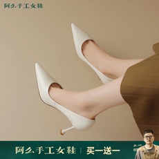 阿么手工女鞋软羊皮黑色高跟鞋通勤尖头白色真皮一脚蹬气质单鞋女