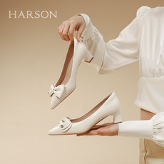 哈森粗跟单鞋女秋季新款水钻方扣气质尖头羊皮革女鞋HL247925