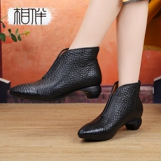 相伴真皮短靴女新款羊皮女鞋秋冬棉鞋超软女靴尖头复古靴子