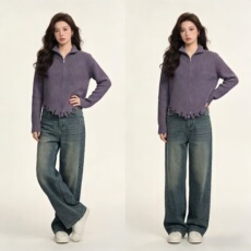 秋冬宽松加厚坑条针织开衫女 不规则毛边高领双头拉链毛衣辣妹风